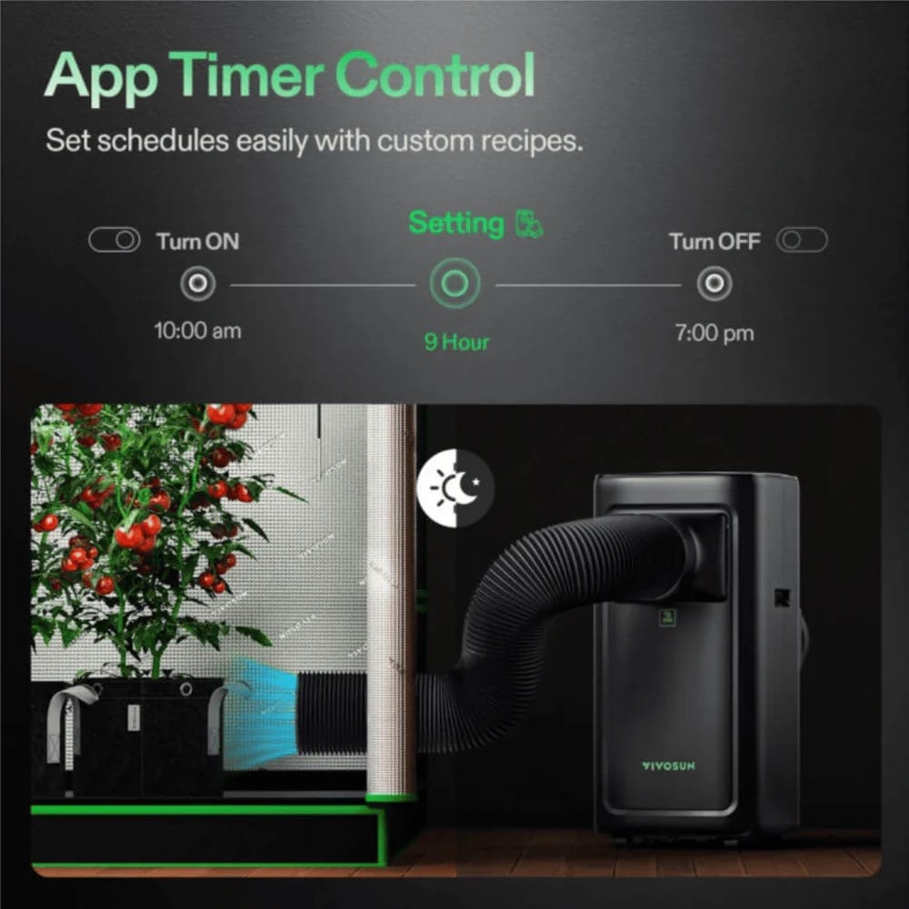 The unit connects to the VIVOSUN App, allowing full remote access to settings, timers, and environment data.